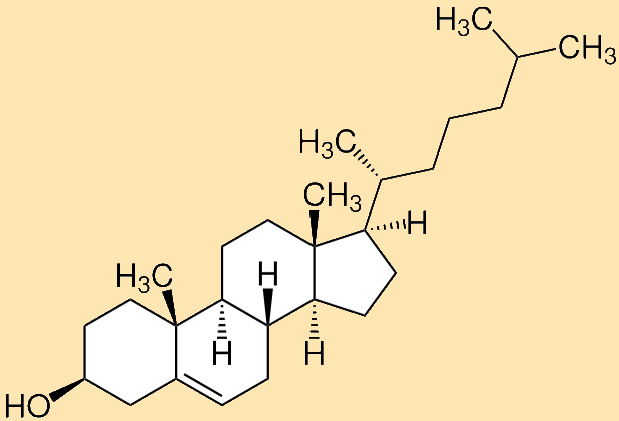 | Kein Fett, aber ein fettähnlicher Stoff ist Cholesterin. Von der Molekülstruktur her hat Cholesterin (griech.: cholé „Galle“ / stereós ‚fest‘) nur wenig gemeinsam mit den Fettsäuren bzw. Triglyceriden. Es gehört zur Gruppe der Steroide (griech.: stereós „fest“ / -oeidḗs „Ähnlichkeit“) und ist bei Tier und Mensch zu finden, nicht bei Pflanzen. Es wird aus drei sechseckigen und einem fünfeckigen Kohlenstoffring aufgebaut. Seine Gemeinsamkeit mit den Fetten besteht vor allem in seiner Wasserunlöslichkeit.Cholesterin wird entweder über die tierische Nahrung dem menschlichen Körper zugeführt – im Durchschnitt 300 bis 800 mg – oder vom Körper selbst über einen energieverbrauchenden komplexen Syntheseweg hergestellt. Hauptorte der Cholesterinproduktion sind die Leber – bis zu 700 mg täglich – und die Darmschleimhaut. Bei gesunden Menschen wird die Cholesterinproduktion des Körpers bei zu hoher Aufnahme von Cholesterin durch die Nahrung reduziert. Bei Aufnahme zu viel gesättigter Fettsäuren wird dieses Gleichgewicht gestört.Das Gehirn, das ohne Cholesterin nicht funktionsfähig ist, produziert sein eigenes Cholesterin, da dieser Stoff die Blut-Hirn-Schranke nicht passieren kann. Eine positive Bedeutung des Cholesterins für das Gehirn ist z.B. Gegenstand neurobiologischer Forschung (siehe folgende Links).